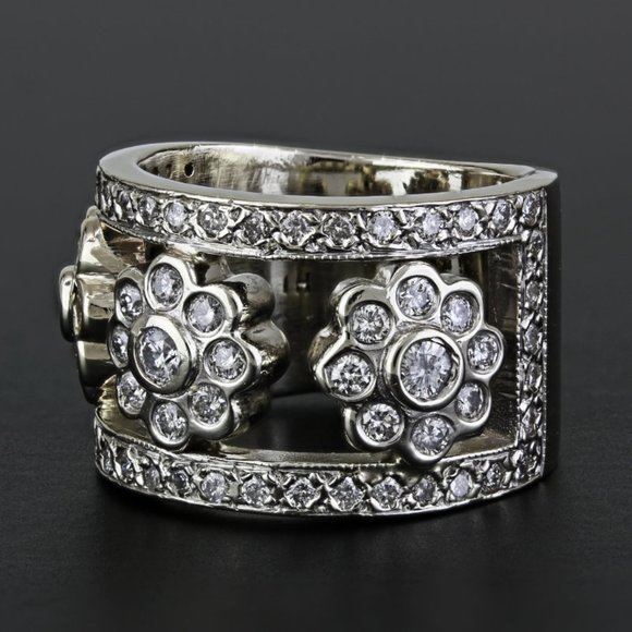 14K White Gold Diamond Flower Band Cocktail Statement Ring