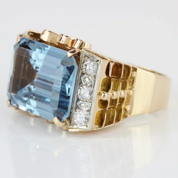 14K Yellow Gold Vintage Swiss Blue Topaz & Diamond Anniversary Statement Ring