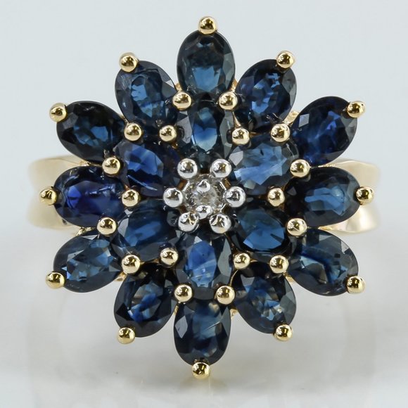 Vintage 14k Yellow Gold Sapphire and Diamond Flower Cocktail Statement Ring