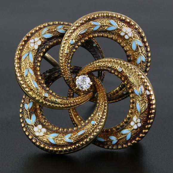 Antique Victorian 21k Yellow Gold Diamond & Enamel Floral Brooch Pin
