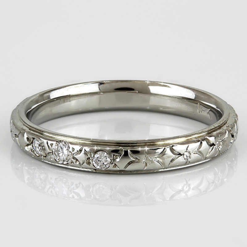Vintage 1940s 18k White Gold Engraved Diamond Wedding Band Ring Floral Estate