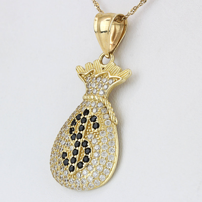 10K Gold White & Black CZ Cubic Zirconia Encrusted Dollar Sign Money Bag Pendant