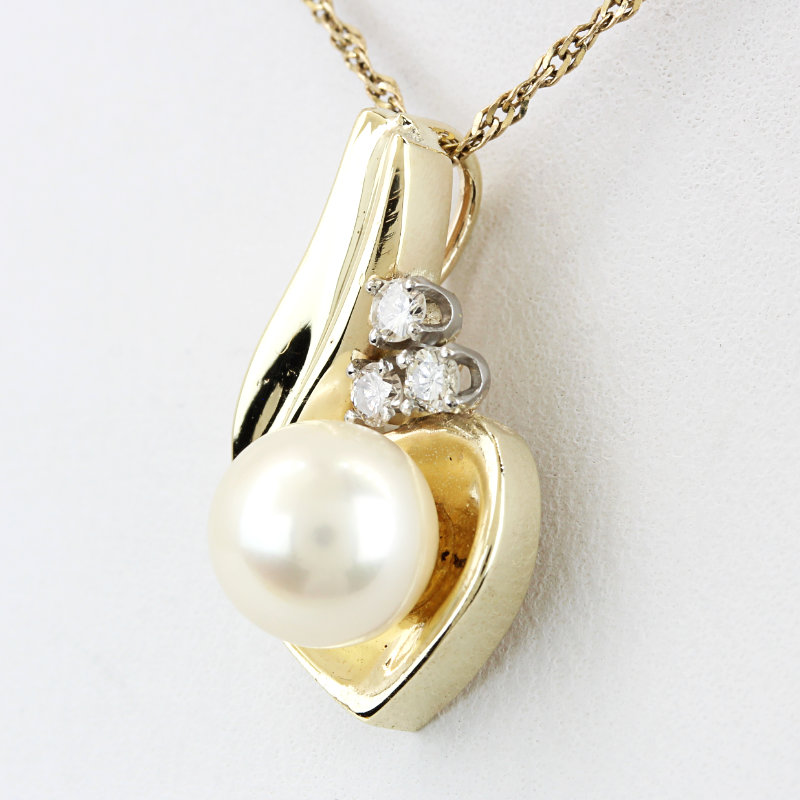 14 Karat Yellow Gold 3-Diamond & Pearl Tear Drop Pendant