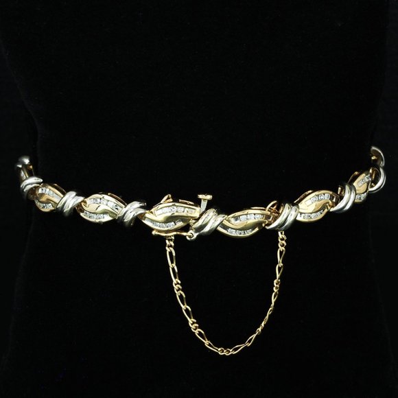 This stunning wavy-style bracelet is made of alternating 14 karat yellow and white gold links with a half carat of round-cut diamonds placed in channel settings throughout. The bracelet is about 7″ long and has an additional safety chain preventing the bracelet from snapping open and just falling off your wrist. The bracelet is in overall excellent condition with very little signs of wear. “CRP” 7 a maker’s mark are stamped onto the inside part of the link.