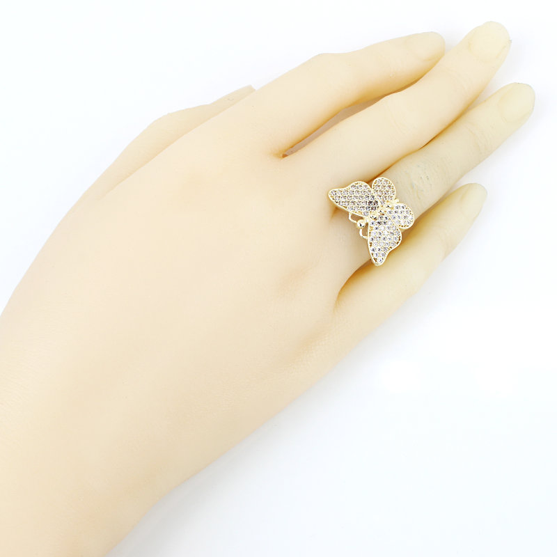 This stunning butterfly-shaped ring radiates elegance with its intricate gold framework and shimmering array of round-cut stones. Each wing is encrusted with brilliant gems that catch the light from every angle, creating a dazzling, eye-catching effect. Perfect as a statement piece or a gift, it blends whimsical charm with luxurious craftsmanship.