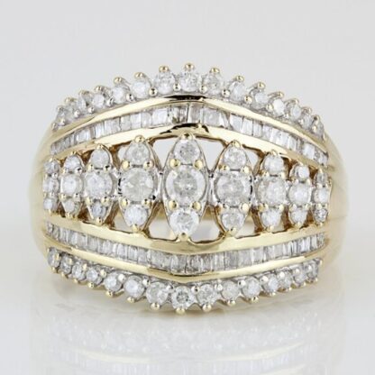 Elevate your jewelry collection with this stunning 10 Karat Yellow Gold ring, designed to dazzle. The centerpiece features a columned row of brilliant round diamonds, flanked by four elegant rows of both round and baguette-cut diamonds for a radiant, multidimensional sparkle.