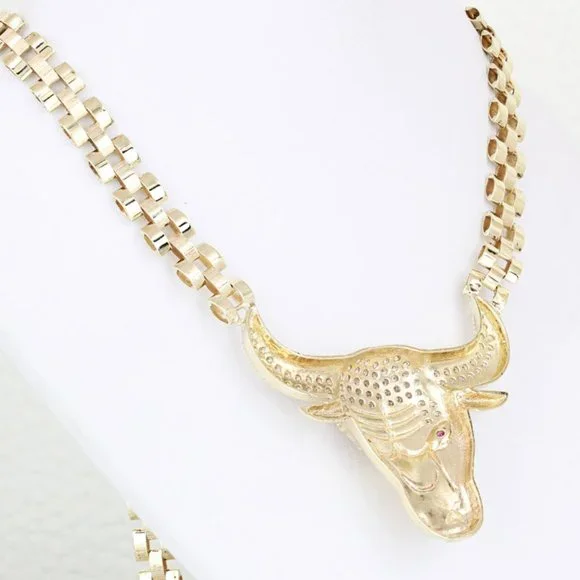 This is a stylish necklace made of 10 karat yellow gold and was made with an attractive watch-style chain measuring at 19 inches in length. The chain supports a highly detailed Chicago Bulls logo pendant fitted with Cubic Zirconia & Red Spinel gemstones. Has a lobster claw clasp that allows for easy wear / removal & has “10K” stamped on sections of it. In great condition!