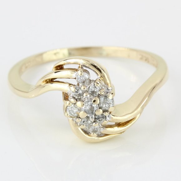 Crafted in rich 14 karat yellow gold, features a dazzling cluster of 9 round-cut diamonds, artfully arranged in a graceful swirl that catches the light and attention from every angle. With a total diamond weight of .20 carats, it’s the perfect balance of sparkle and sophistication. Stamped with “14K,” “LOVESONG,” “FCRD,” and Fritz Rossier’s maker’s mark, this piece is a wearable work of art. The band is a comfortable size 8.25 and can be resized to fit your perfect harmony.