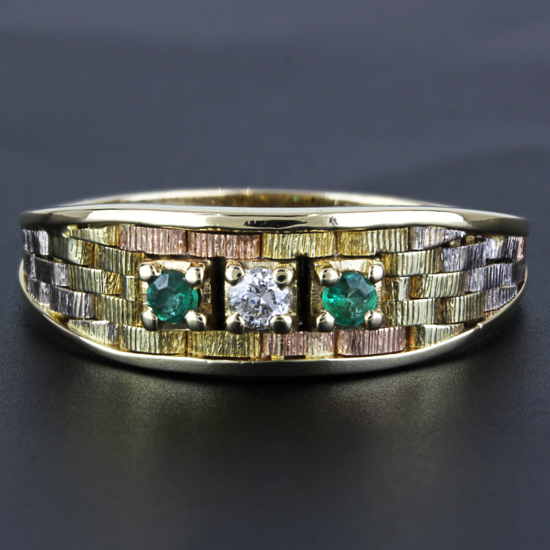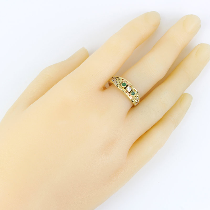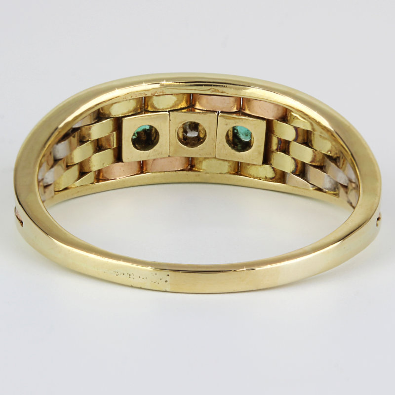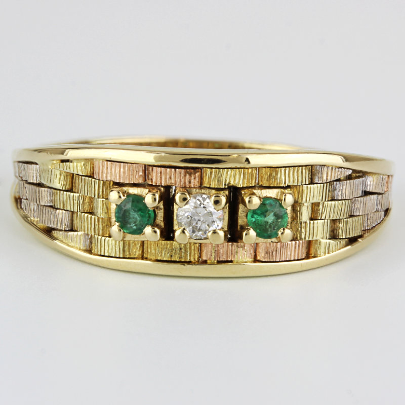 This ring is made of 14 karat tri-tone gold and has a highly-detailed basketweave design with three settings on the front that hold 2 emerald & a single diamond in the center. The band is a size 8.25 and is in excellent condition.