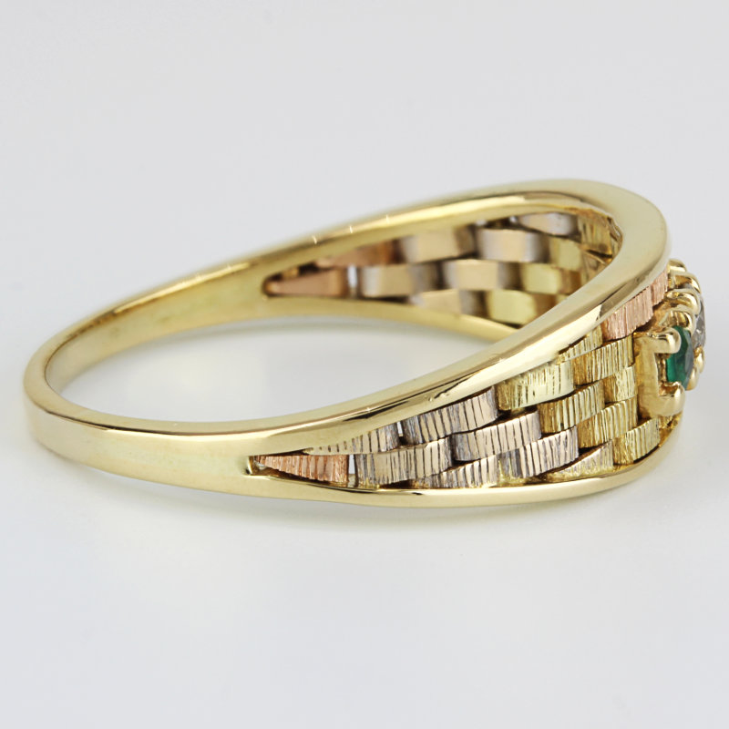 14K Tri-Tone Gold Emeralds & Diamond Basketweave Ring