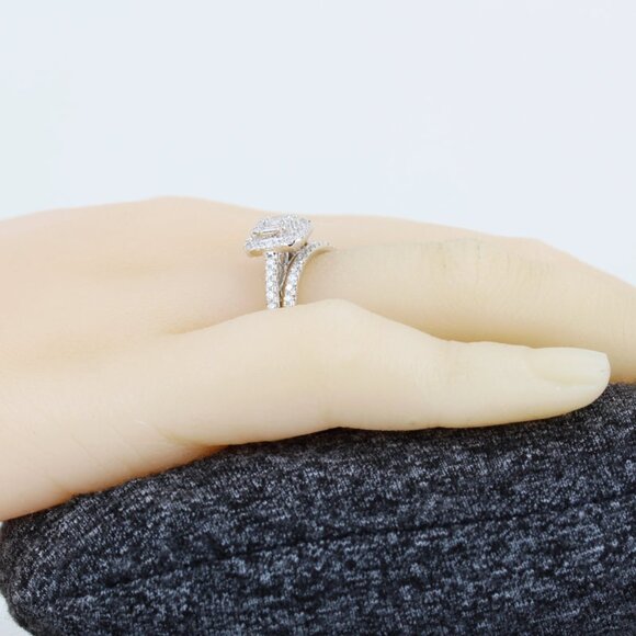 This gorgeous wedding ring set is made of 14 karat white gold & is in excellent condition. The main ring contains a beautiful assortment of baguette & round-cut diamonds in a square-shaped halo setting. The secondary ring features a simple, but attractive design containing 15 round-cut Diamonds, making for a ring set that is sure to impress! Each ring is a size 7 but can be resized. Stamped “SKD” & “14K”.