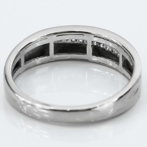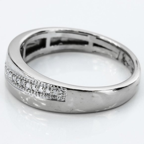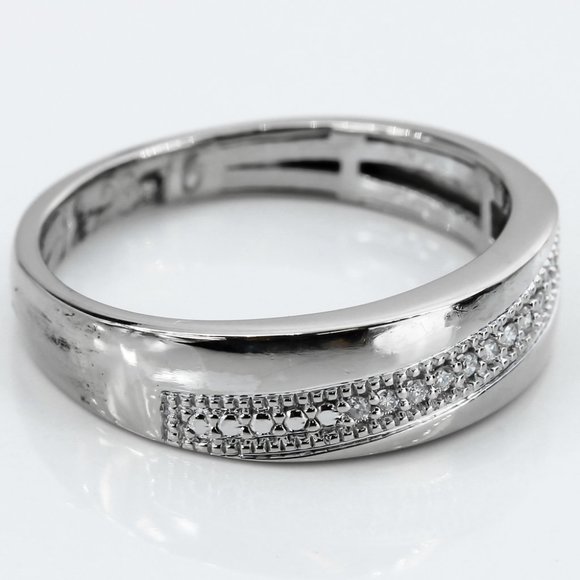 Celebrate timeless elegance with this stunning 14 karat white gold band, designed with a refined angled milgrain setting. Ten sparkling melee diamonds are delicately pavé-set within the band, adding a touch of brilliance to its classic silhouette. Whether for a wedding, anniversary, or a meaningful gift, this ring offers understated luxury and enduring style.