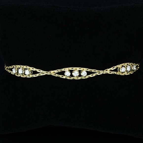 This elegant 14k yellow gold bracelet showcases nine round diamonds (0.50ctw) arranged in sets of three within a weaving chain design. Measuring 8 inches in length, this piece offers a comfortable fit and is secured with a classic box clasp. With its radiant gold and sparkling diamonds, this bracelet is the perfect blend of sophistication and everyday wearability.