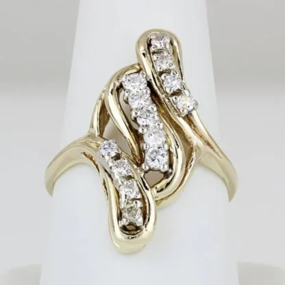 This attractive cocktail ring is made of 14 karat yellow gold and contain 12 round-cut Diamonds set on a unique wavy, three-level band design that is sure to impress! The band is a size 9.5 but may be resized by any qualified jeweler. “14K” is stamped onto the inside part of the band. In very good condition with few or no signs of previous wear.