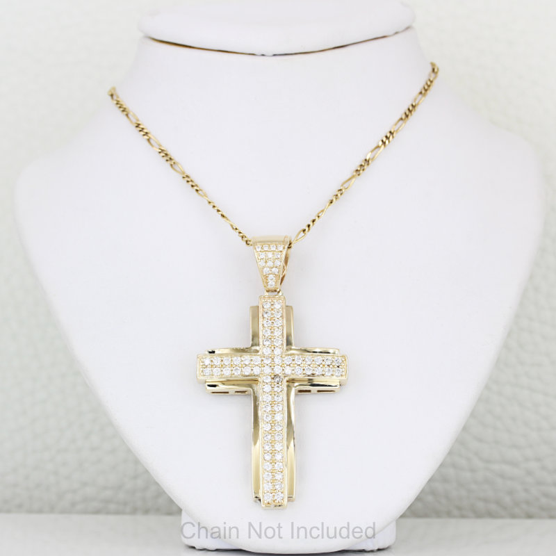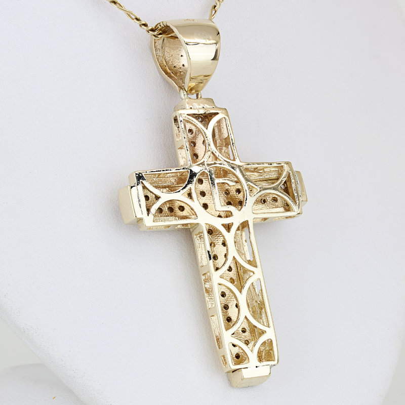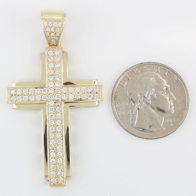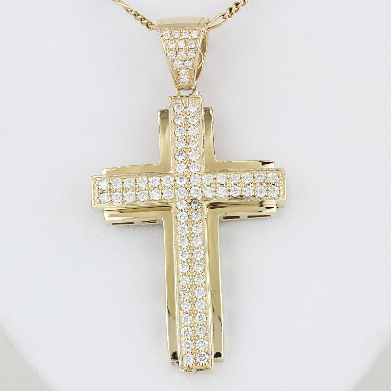 Crafted in radiant 14K yellow gold, this striking cross pendant is more than jewelry—it’s a declaration of faith. Set with 80 natural diamonds in a richly textured pavé pattern, it radiates both light and meaning. The bold, architectural design and substantial weight give it undeniable presence, making it a powerful personal symbol or a meaningful gift for someone deeply rooted in their beliefs.