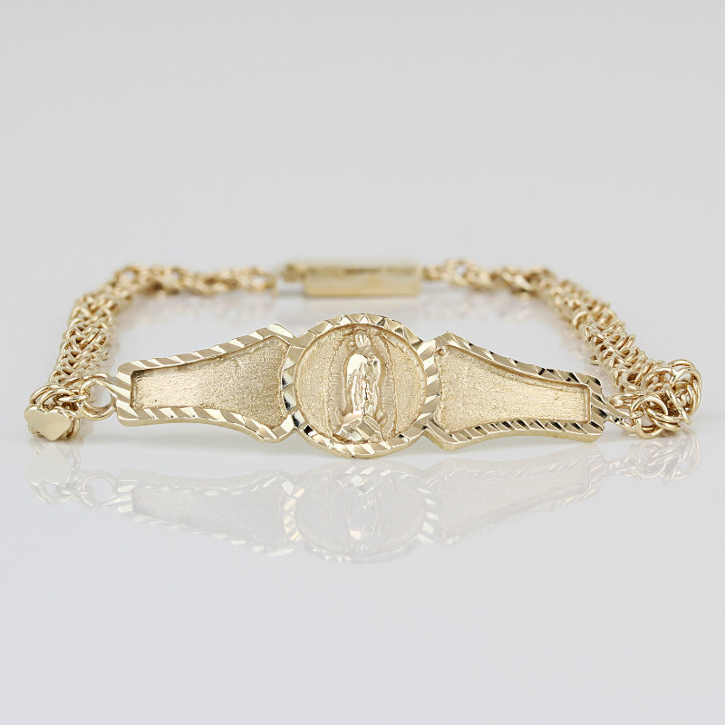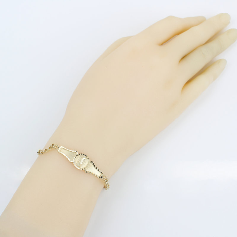 This gold bracelet features a central medallion with a raised depiction of the Virgin Mary, blending spiritual symbolism with elegant design. Its double chain link structure and twisted rope edges add texture and dimension, enhancing its visual appeal. Ideal for both devotional wear and fashion-forward styling, it serves as a meaningful statement piece.