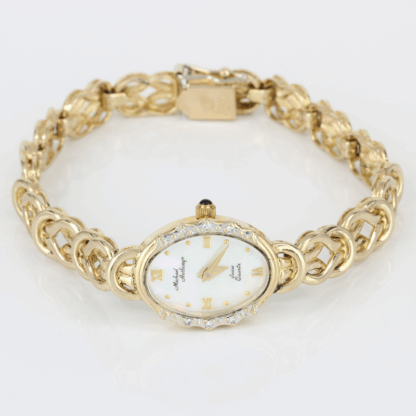 Elevate your style with this exquisite timepiece from Michael Anthony—a perfect blend of timeless sophistication and refined craftsmanship. Crafted entirely from solid 14K yellow gold, this watch radiates warmth and luxury. Features a luminous mother of pearl face adorned with classic Roman numeral markers, offering a graceful nod to vintage elegance. The bezel sparkles with six single-cut diamonds, adding a delicate touch of brilliance. Powered by Swiss-made quartz, ensuring precise and reliable timekeeping. Whether you’re dressing up for a special occasion or adding a touch of glamour to your everyday look, this Michael Anthony watch is a statement piece that speaks volumes.