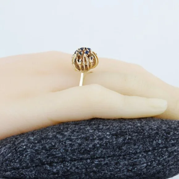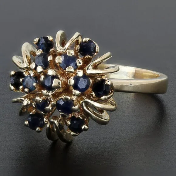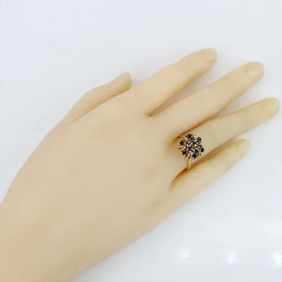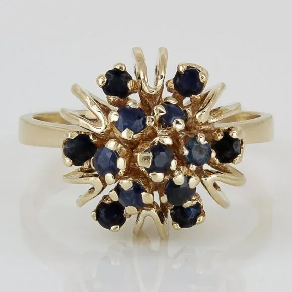 This beautiful anniversary / cocktail ring is made of 14 karat yellow gold & features a unique dome setting style fitted with 13 dark blue Sapphire gemstones in prong settings. The band is a size 7.5 but may be resized by any qualified jeweler. “14K” is stamped onto the inside part of the band. In good condition with only minor signs of wear.