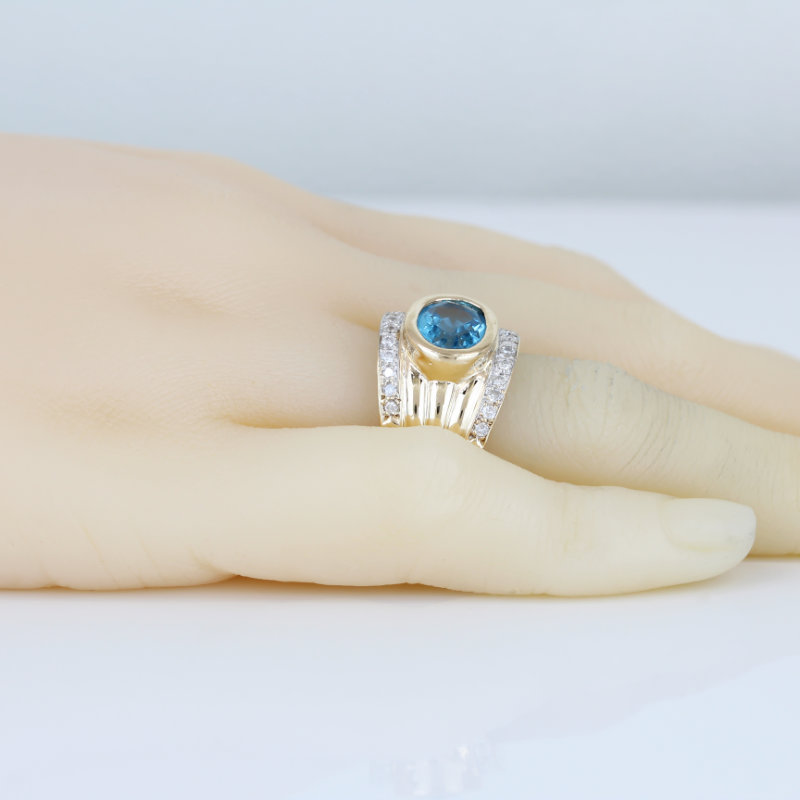 14K Yellow Gold Swiss Blue Topaz Diamond Cocktail Statement Anniversary Ring