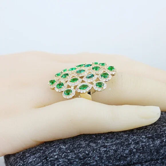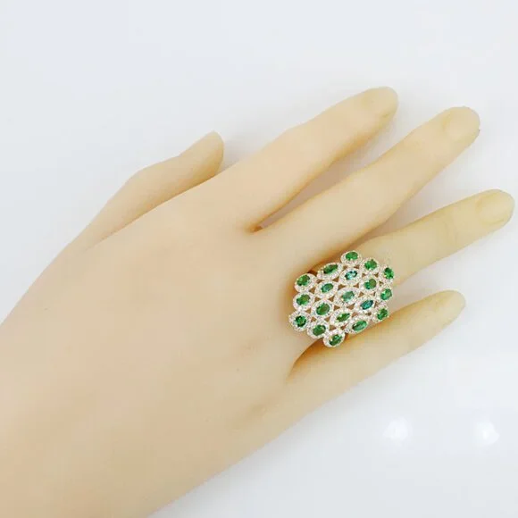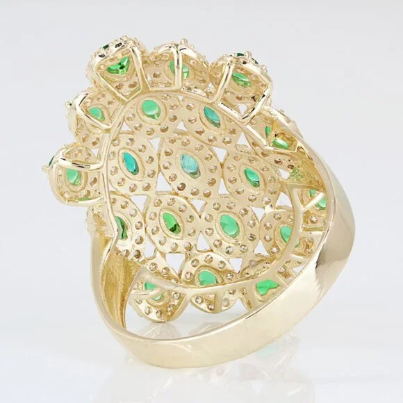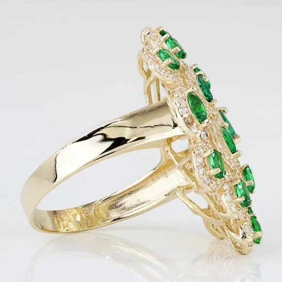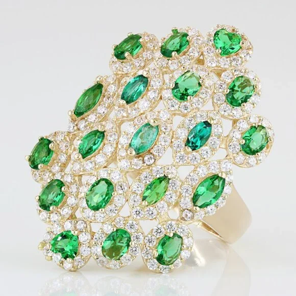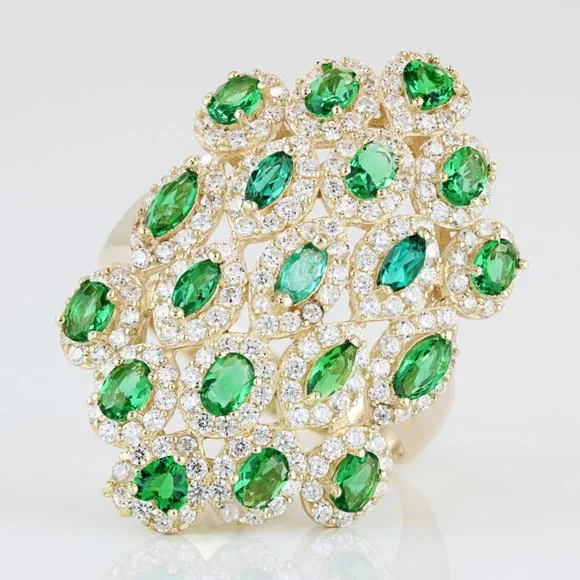 This cocktail ring is made of 14 karat yellow gold and features multiple oval-shaped prong settings fitted with green Cubic Zirconia stones. Additional white CZ stones are set around the green stones, really helping this ring stand out. Two of the green CZ stones at the very top & the very bottom are cut like hearts. The band is a size 10 but may be resized by a qualified jeweler. In excellent condition!