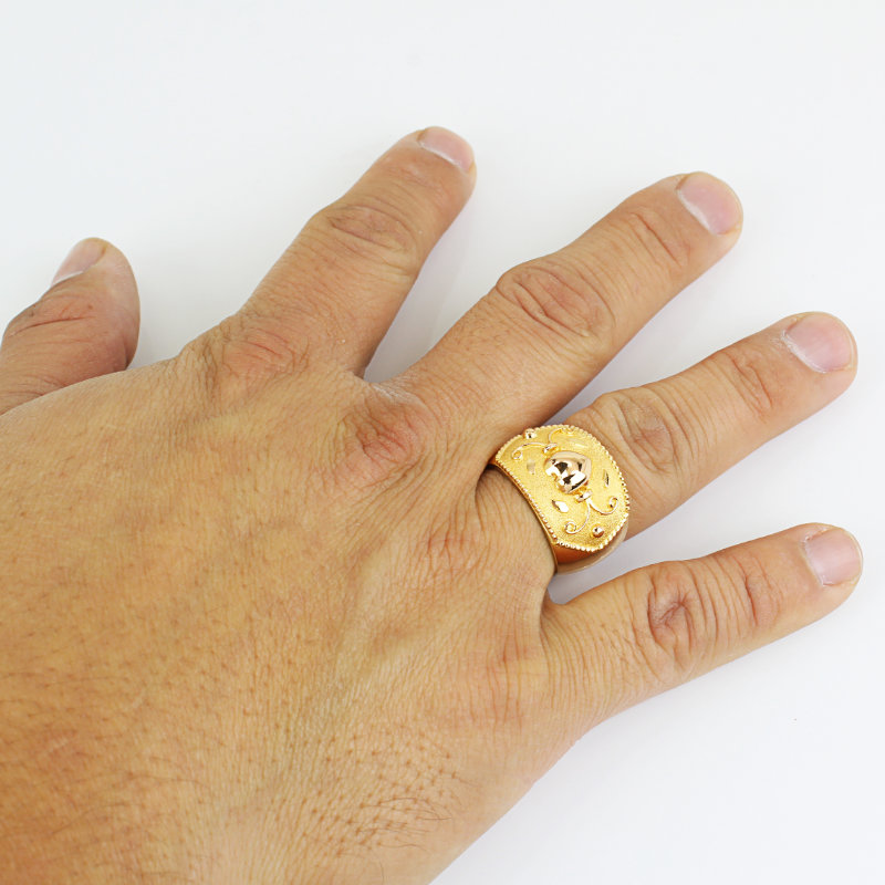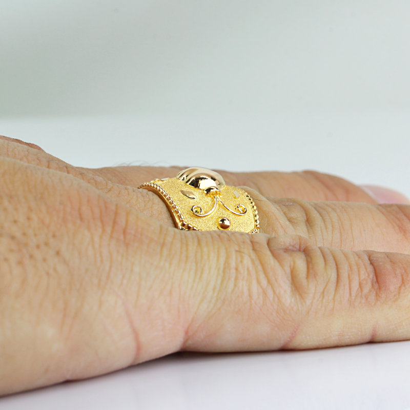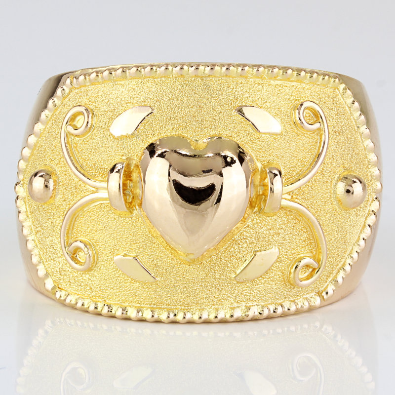 This ring is made of 21 karat yellow gold and features a highly-detailed 3D Heart design across a laser etched background, with lovely scrolls on both sides of the heart. The band is a size 9.75, has a 16.3mm width & is signed with “RDI” on the inner side of it. The size is adjustable.