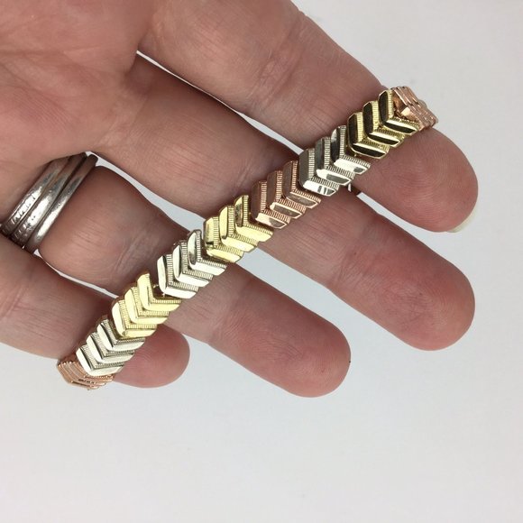 This stunning bracelet is made of 10 Karat White, Yellow, and Rose Gold featuring v-shaped links all throughout the bracelet. This bracelet is in overall excellent condition with minor scratches which are not easily seen. This bracelet measures 7 inches of length and 8.90mm of width. It weighs a total of 5.55 dwt which is equivalent to 8.63 grams of gold. This bracelet is perfect for a mothers gift or even an anniversary gift! The combination between the different types of gold allow this bracelet to pop out due to the reflection it provides. Though this design seems simple, it will make a beautiful statement when seen on the body.