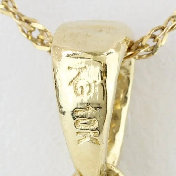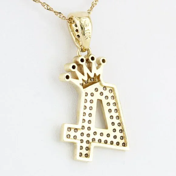 This flashy pendant is made of 10 karat yellow gold and was designed as a block font number 4 with a crown sitting on top of it, entirely encrusted with cubic zirconia stones. The bail is able to fit most smaller chain sizes and is also fitted with 5 CZ stones, finalizing the look. Stamped “10K” & an “NG” maker’s mark are stamped onto the top of the bail.