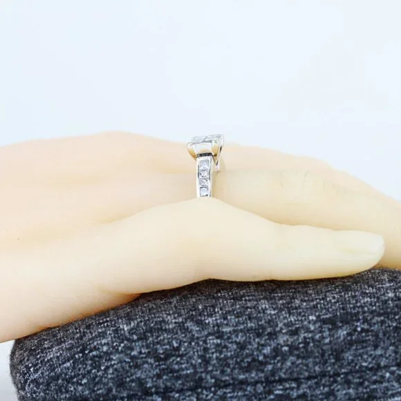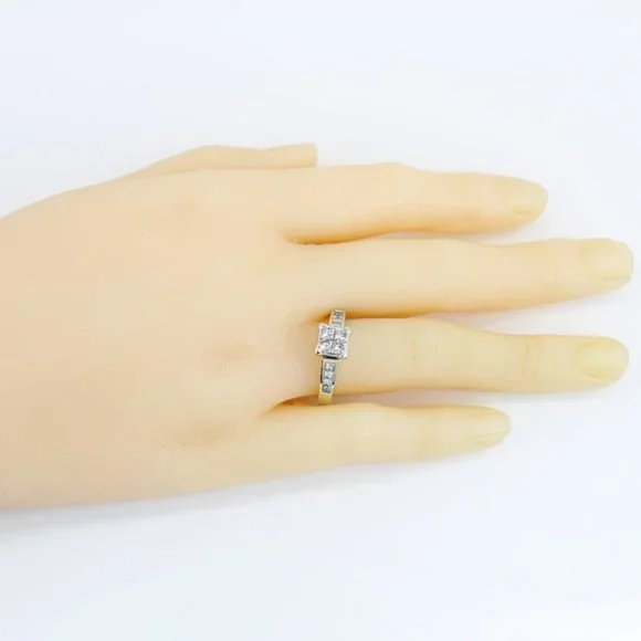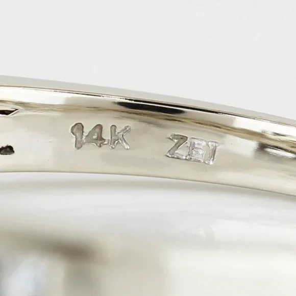 This beautiful wedding ring is made of 14 karat white gold & contains 12 Princess-cut diamonds, 4 of which are larger and set together in a centered square prong setting. The 8 additional diamonds are set in channel settings at the sides. The band is a size 6.75 but may be resized by any qualified jeweler. “14K”, “30” & a “ZEI” maker’s mark are stamped onto the inside part of the band. In very good condition.