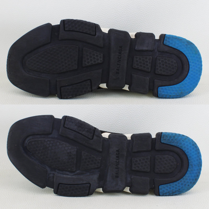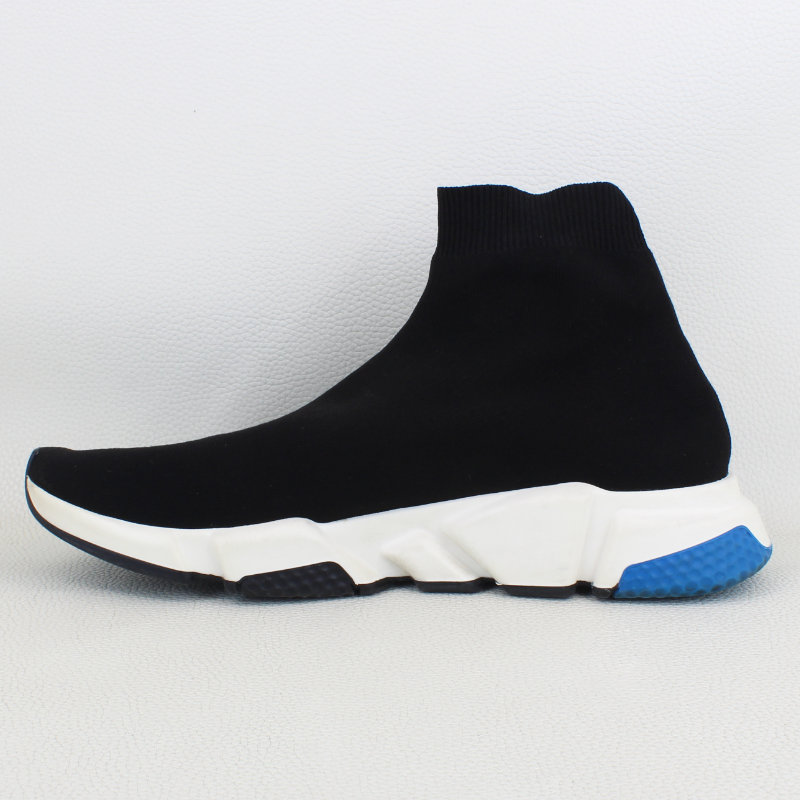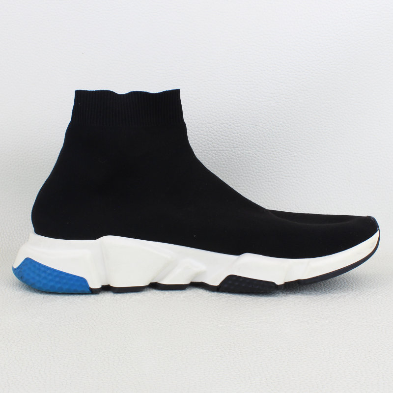 This is the Balenciaga Speed Sneaker, a luxury shoe known for its iconic “sock-like” design. It features a breathable, black technical 3D knit upper and a chunky, shock-absorbing white sole with a blue accent at the heel. This minimalist style combines athletic comfort with high-fashion aesthetics for a modern, sleek look.
