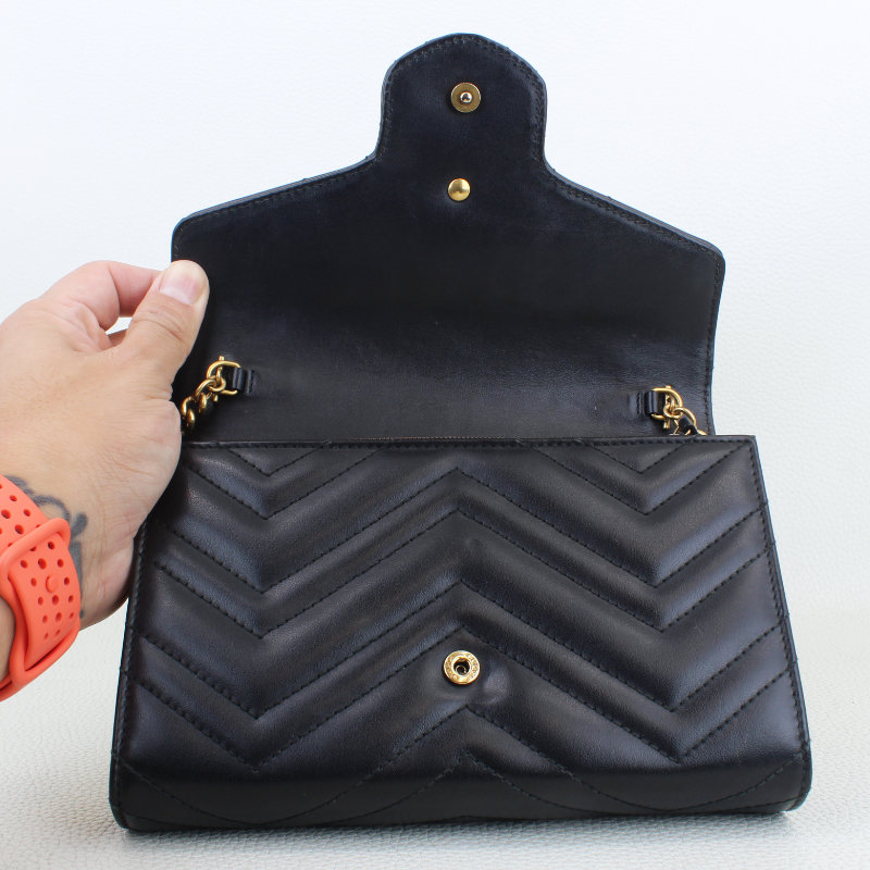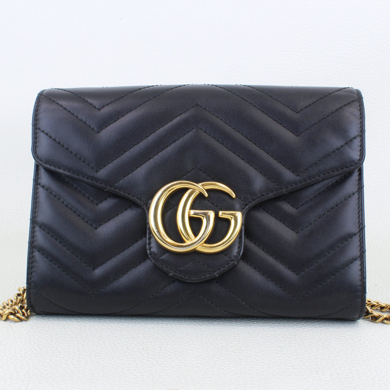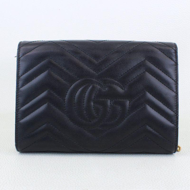 This is an authentic GUCCI Black Calfskin Matelassé Diagonal GG Marmont Chain Wallet. It’s crafted from soft chevron‑quilted calfskin leather and finished with an optional aged gold chain strap and the signature gold GG logo on the flap. The snap closure opens to a black fabric and leather interior featuring a zip pocket and multiple card slots for easy organization.