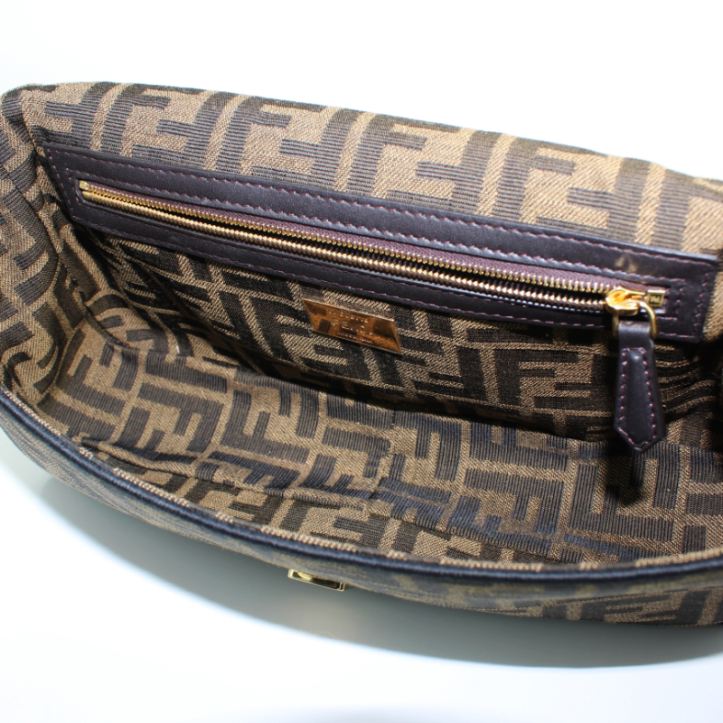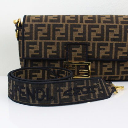 The Fendi Fabric Jacquard FF 1974 Medium Baguette from the Roma Amor Collection in Tobacco, Moro and Black. This stylish shoulder bag is finely crafted of Fendi Zucca canvas in tobacco brown. The bag features a matching top handle and an optional shoulder strap, both with gold hardware. The crossover flap opens with a gold Fendi FF logo clasp to a brown fabric interior with a zipper pocket.