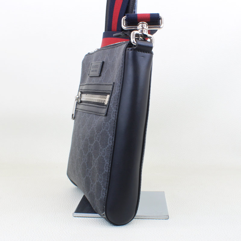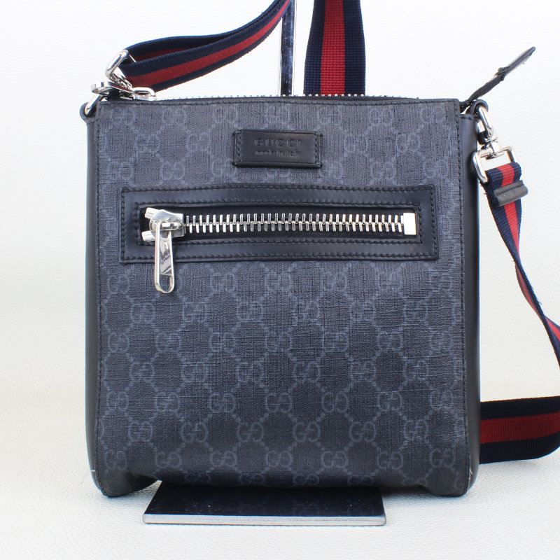 This Gucci GG Supreme Small Messenger Bag is a sleek, everyday accessory featuring the house’s iconic black and grey monogram canvas with smooth leather trim. It is designed for organized utility with a secure zippered main compartment and a front pocket for quick access to essentials. The look is completed by an adjustable blue and red Web strap, allowing for comfortable shoulder or crossbody wear with a signature touch.