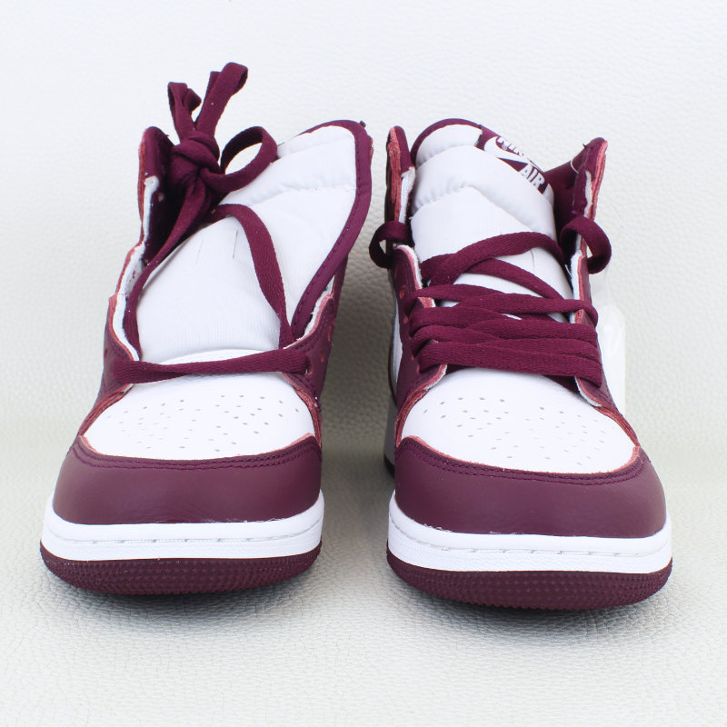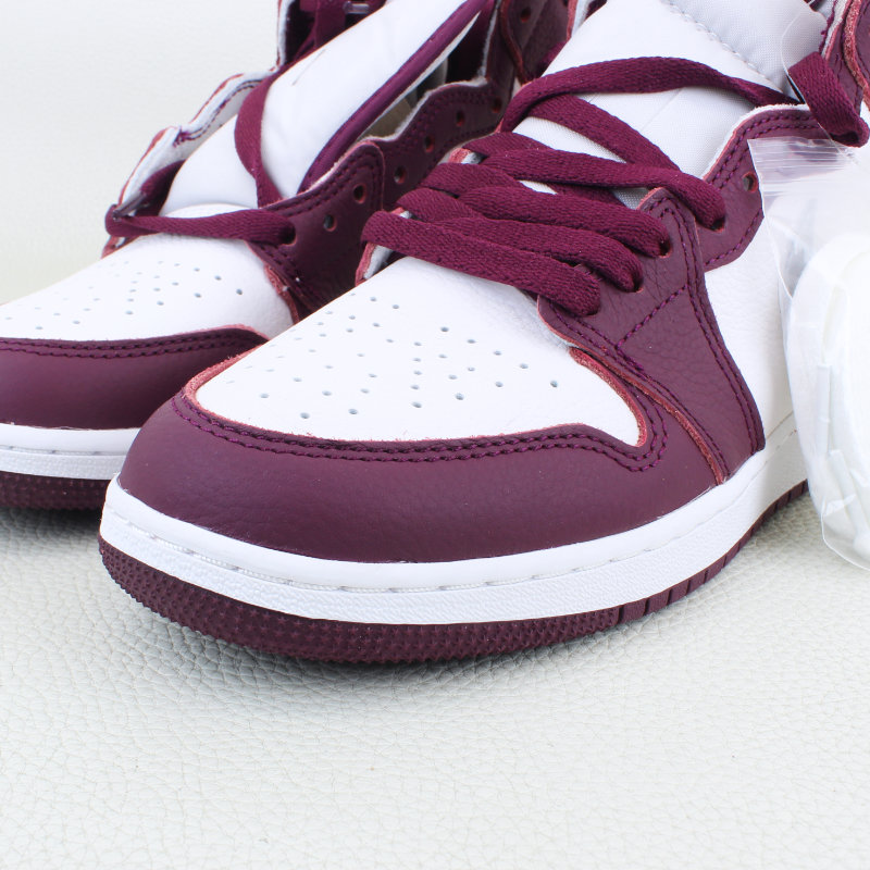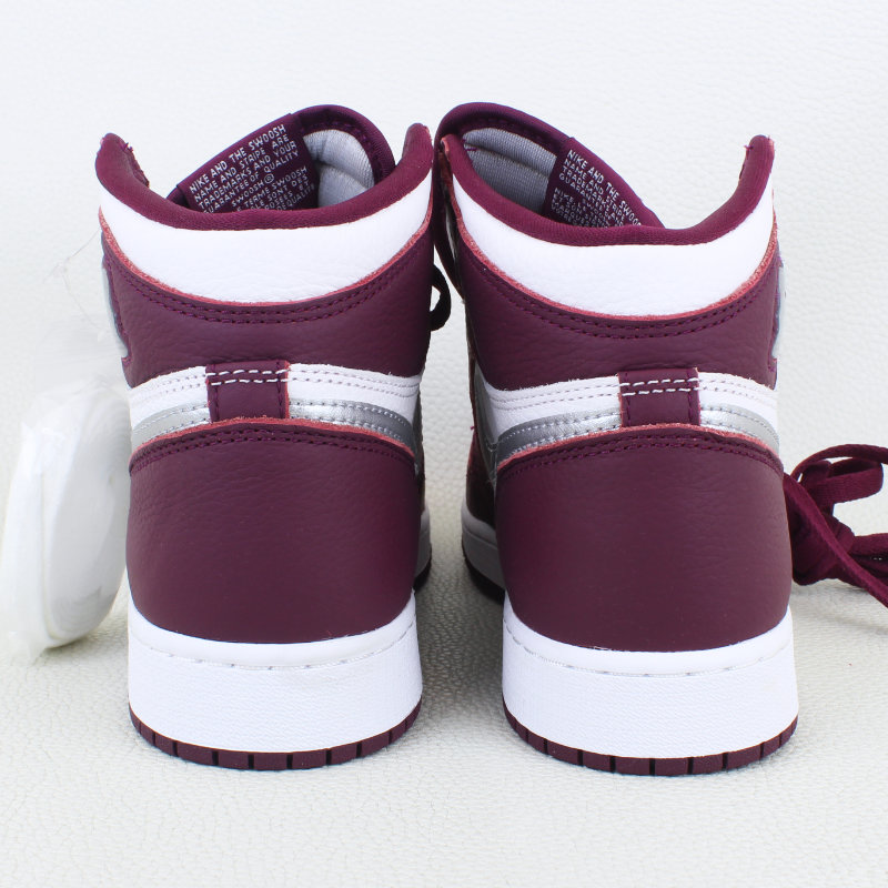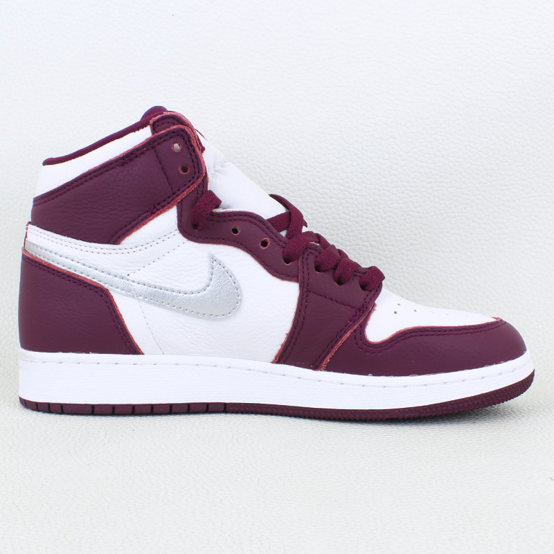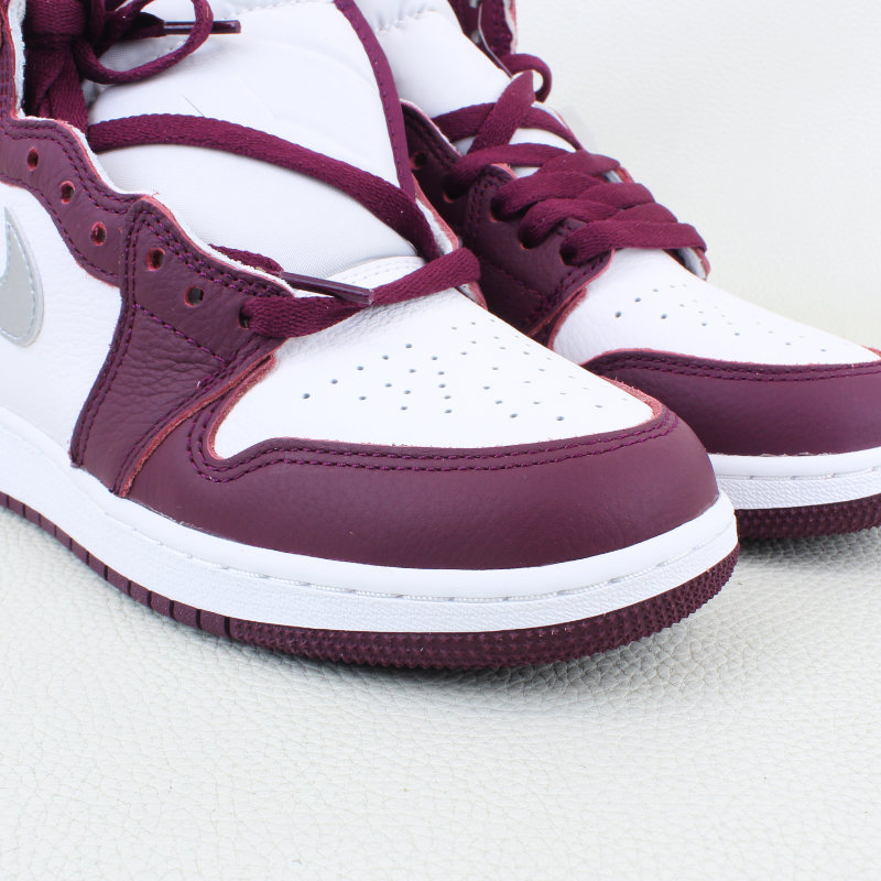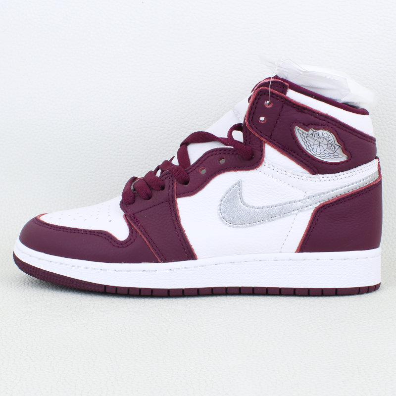 The Air Jordan 1 Retro High OG Bordeaux GS draws inspiration from the Midnight Navy CO.JP and debuted as part of Jordan Brand’s Fall 2021 lineup. It features a white leather base with Bordeaux overlays, a metallic silver Swoosh, and classic OG details like the jeweled Wings logo, woven Nike tongue tag, and a cushioned white midsole over a Bordeaux rubber outsole.