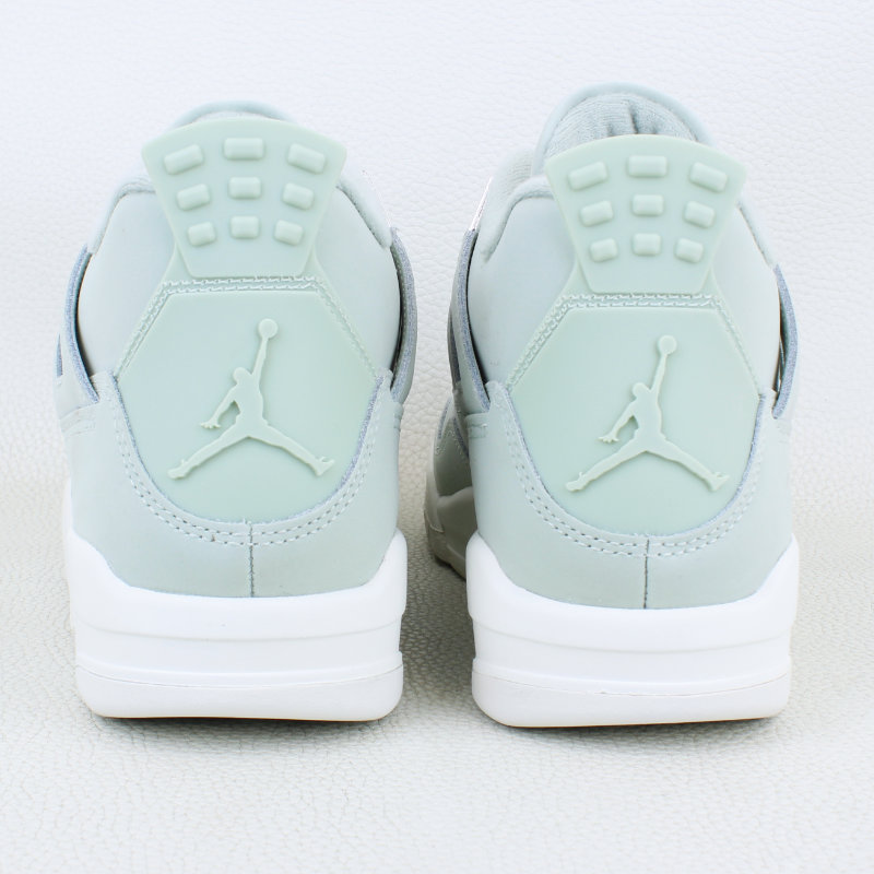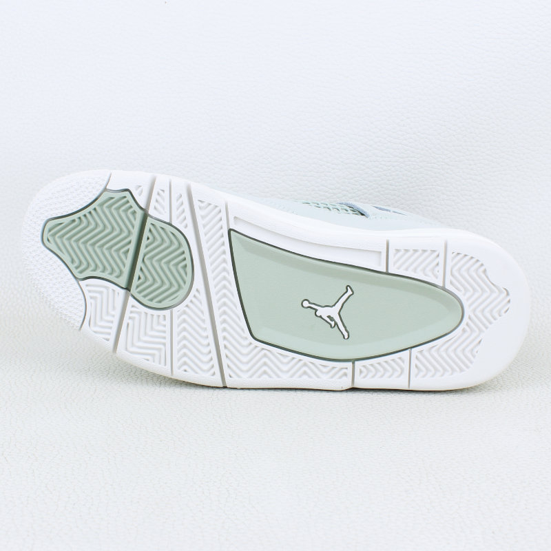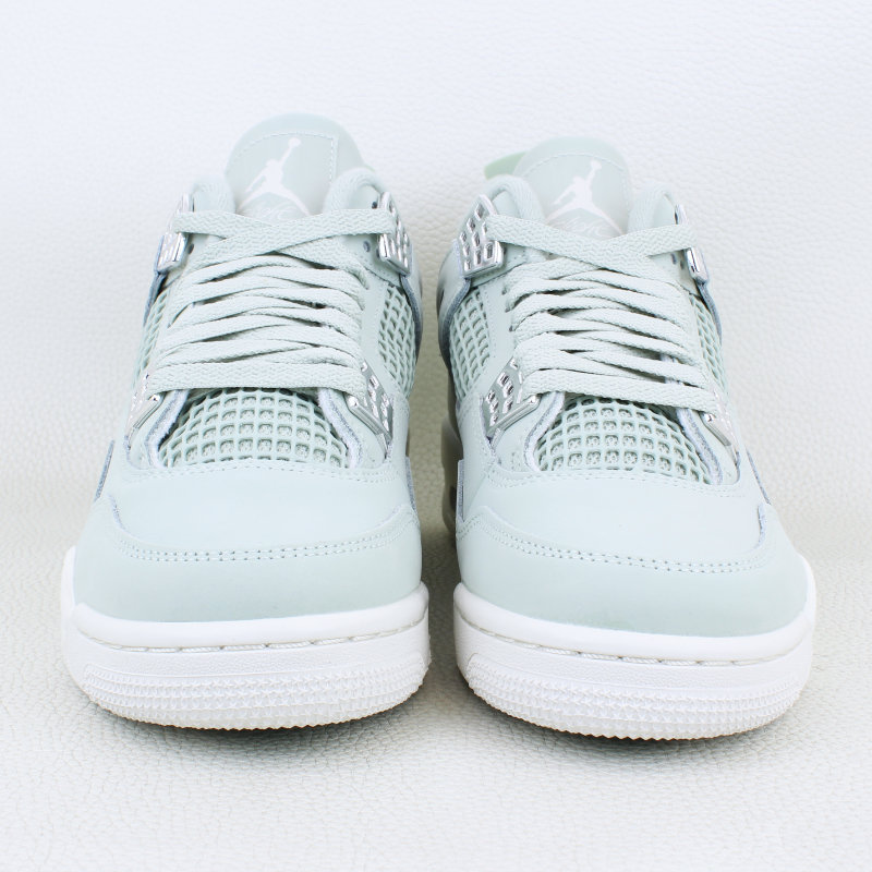 The women’s Jordan 4 Retro Seafoam Sail features a calming mint‑green colorway with a premium nubuck upper for a soft, elevated look. Signature mesh panels add breathability, while metallic silver eyelet accents and classic Jumpman branding complete the design. Its high‑top build delivers the familiar retro Jordan 4 aesthetic.