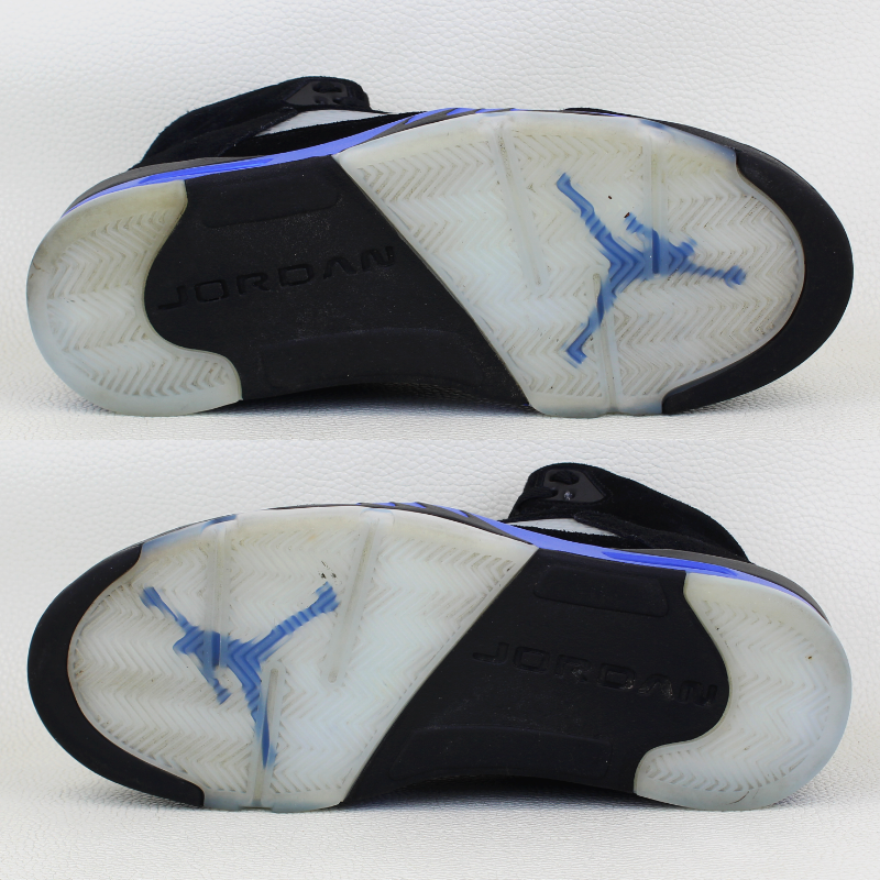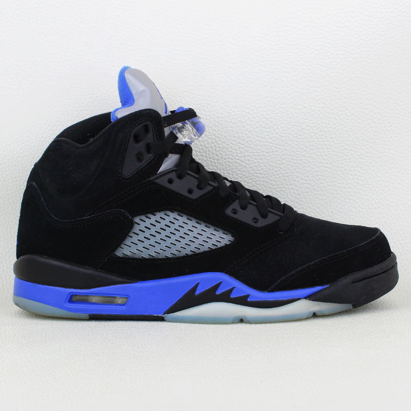 In classic Jordan 5 fashion, the Air Jordan 5 Racer Blue features a black Durabuck upper with signature TPU netted inserts and a reflective padded tongue. At the base, Racer Blue accents pop against a black midsole and icy translucent sole. Beautiful simplicity and a retro edge.