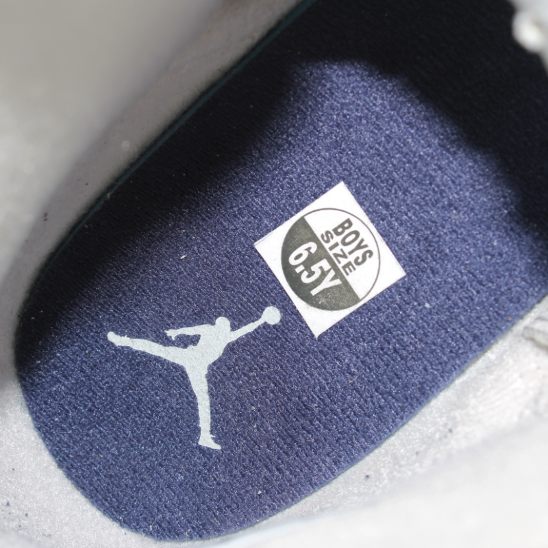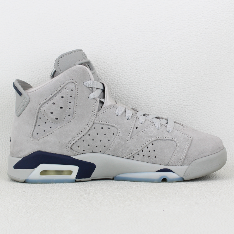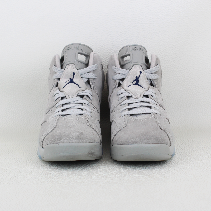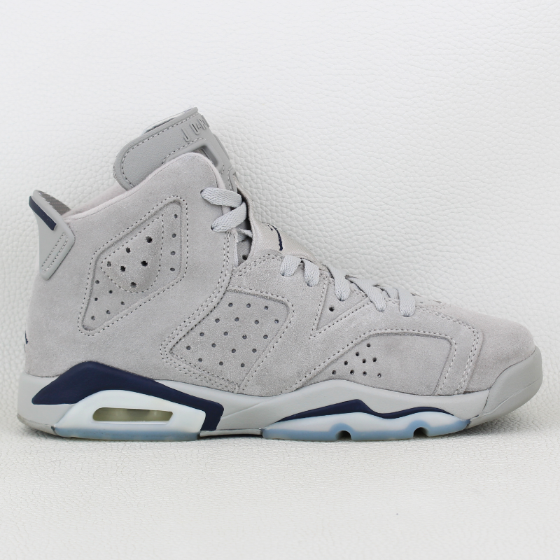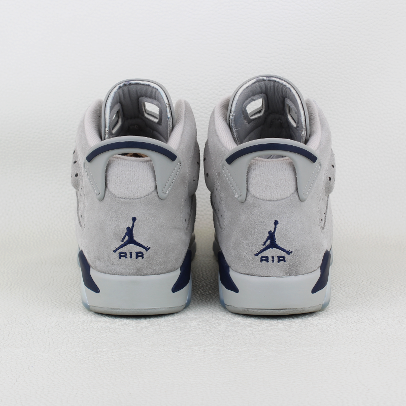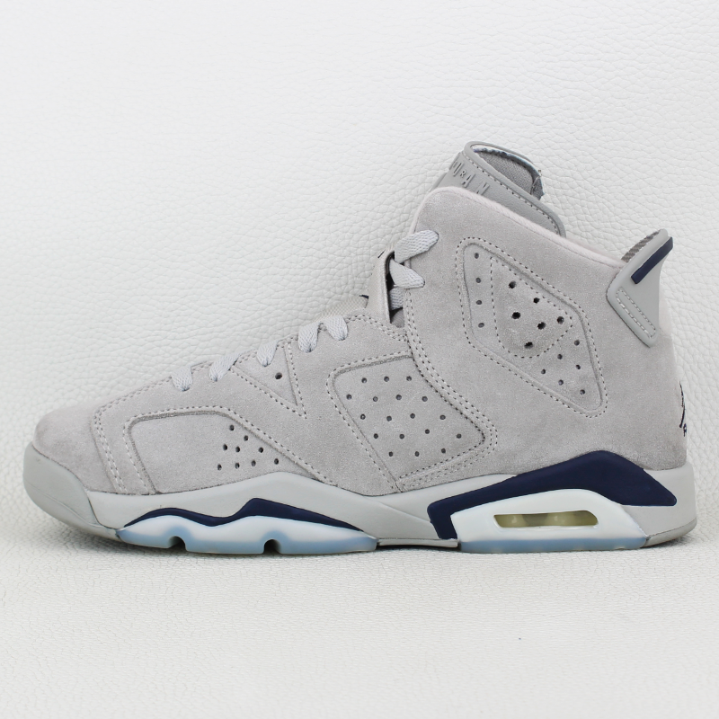 The Jordan 6 Retro Georgetown 2022 (GS) is designed with a gray suede upper with perforated details and a padded collar. An embroidered Jumpman logo is added to the lace guard and rear heel. Navy pops of color compliment the shoe’s silhouette. This casual colorway can be paired on and off the court with ease.