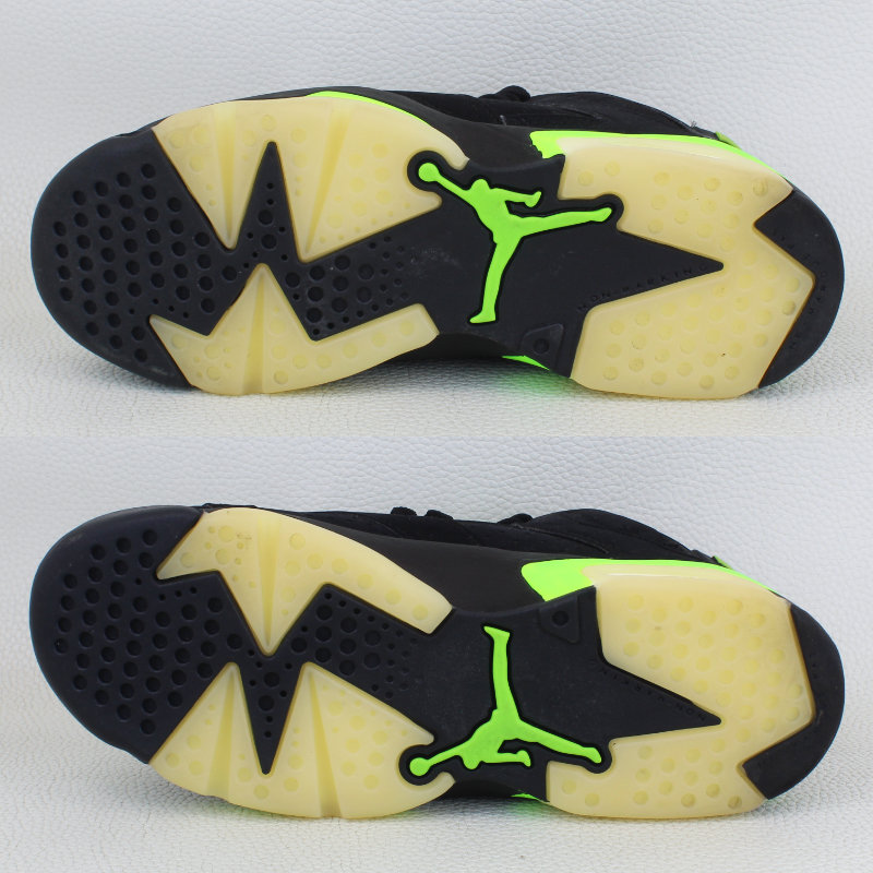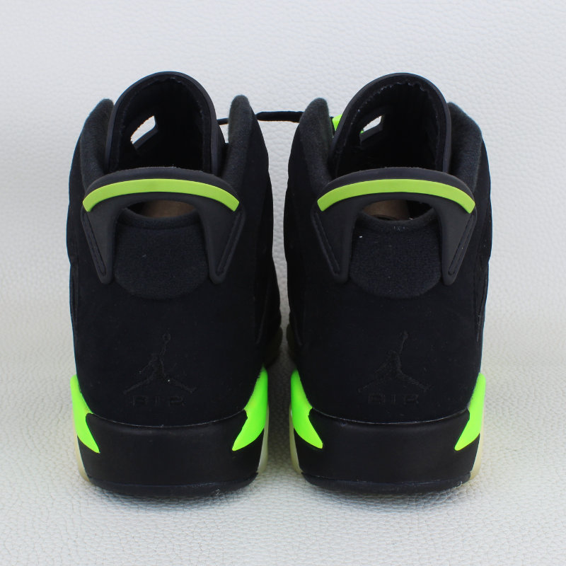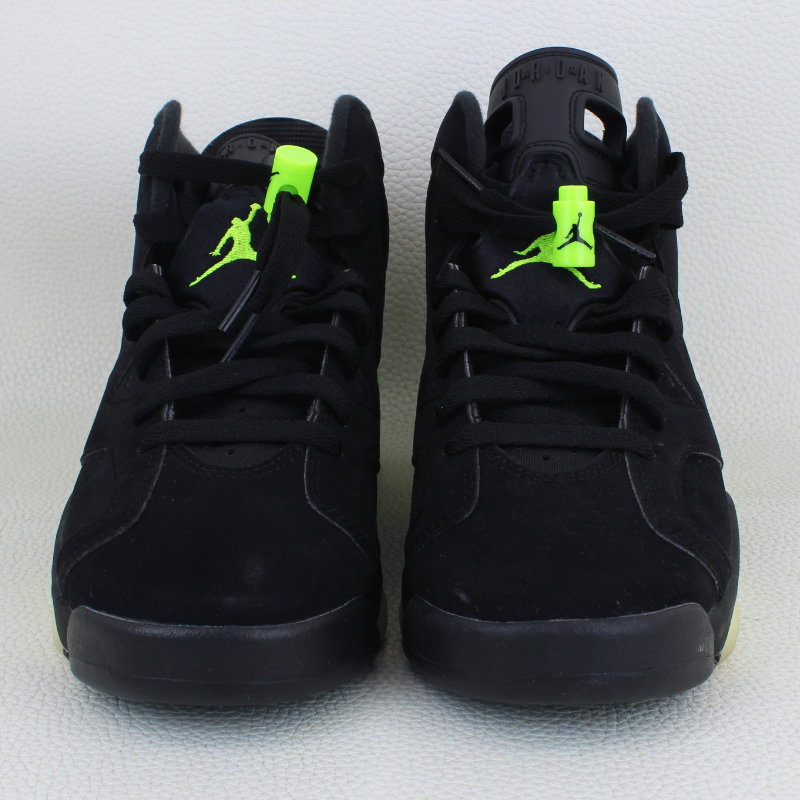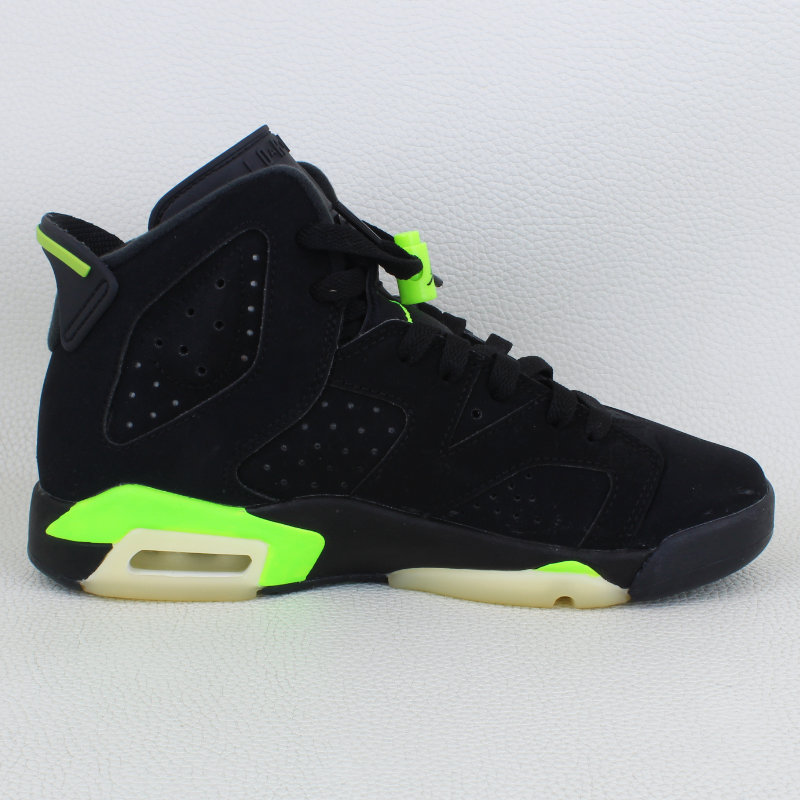Classic Air Jordan 6 silhouette with a black nubuck upper and bold Electric Green accents on the midsole and tongue. Mid-top design, comfortable fit, and a standout look that’s perfect for everyday wear or for collectors who want this colorway in grade school sizing.