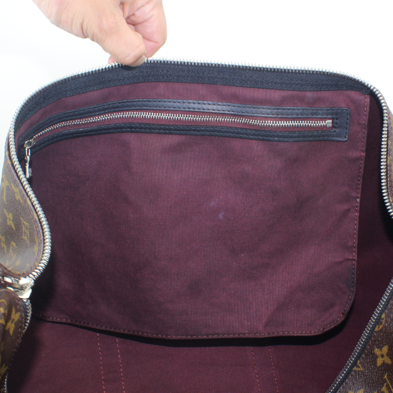 This is an authentic Louis Vuitton Monogram Keepall Bandouliere 55. This stylish Keepall duffel is crafted of classic Louis Vuitton monogram toile coated canvas. The bag features black leather trim, rolled leather top handles, and an optional, adjustable shoulder strap with silver hardware and a removable luggage tag. The top zippers open the bag to a spacious plum-purple fabric interior with hanging zipper pocket.