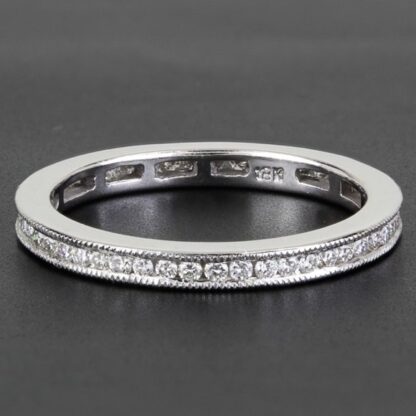 This stunning eternity band by Jolie Designs is crafted from solid 18K white gold and set with 49 round diamonds totaling 0.29 carat, creating a continuous circle of sparkle around the entire band. Delicate milgrain detailing and smooth polished edges add an elegant, timeless touch. The inner band is stamped “18K,” and the ring is in brand‑new, unworn condition. Beautiful on its own, paired with an engagement ring, or stacked with other bands.