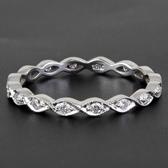 This elegant eternity band by Jolie Designs is crafted from solid 18K white gold and features 18 round‑cut diamonds totaling 0.33 carat. Each diamond is set within a delicate milgrain‑detailed twist pattern that encircles the entire band, creating a timeless and refined look. The inner shank is stamped “18K,” and the ring is in brand‑new, unworn condition. Perfect for stacking, pairing with an engagement ring, or wearing on its own. We are a former authorized Jolie dealer—see our other listings for additional stackable styles.