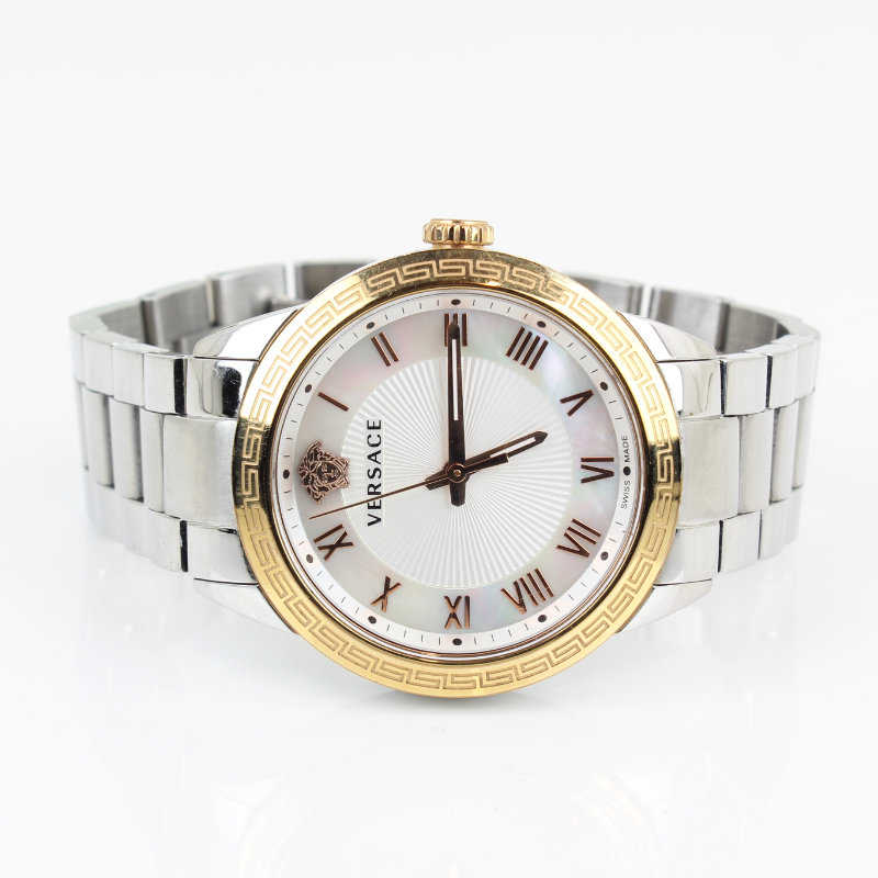 Make a bold statement with this Versace P6Q Rose gold mother of Pearl watch featuring the brands iconic design and craftsmanship. This watch combines elegance with everyday wearability.