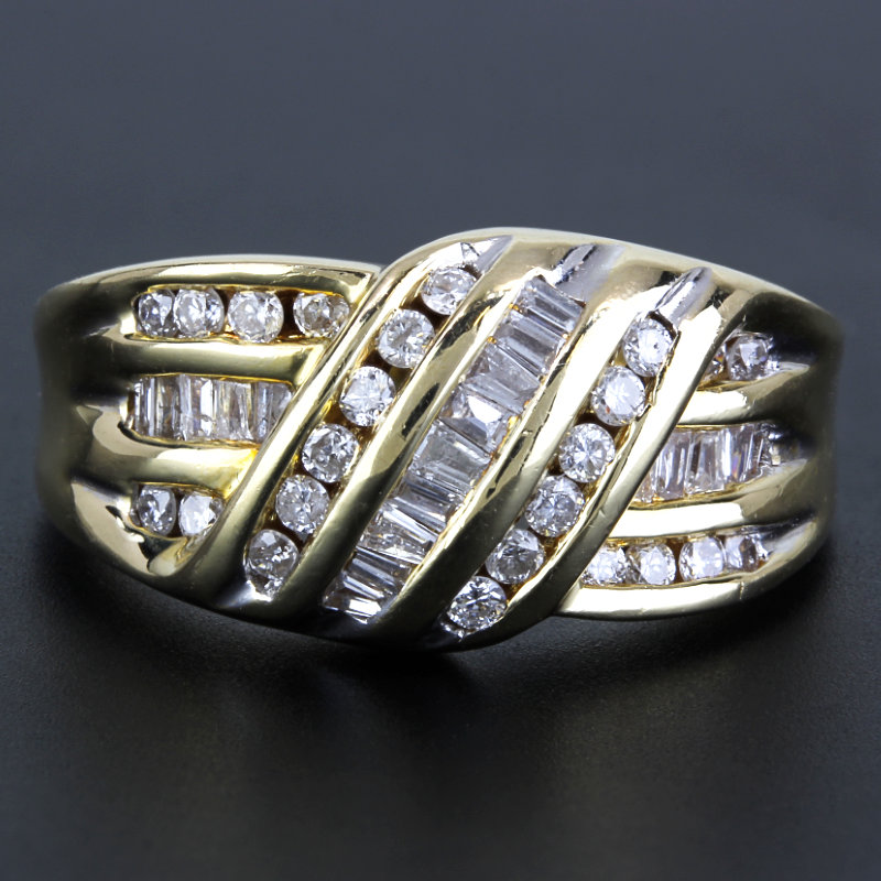 This Vintage Ring is made of 14 Karat Yellow Gold and contains Round-cut and baguette-cut Diamonds for a total of 43 diamonds (.75 carat total) placed along a knot band setting. The size 7 ring has “14K” stamped onto the inside of the band, it can be resized by any qualified jeweler.