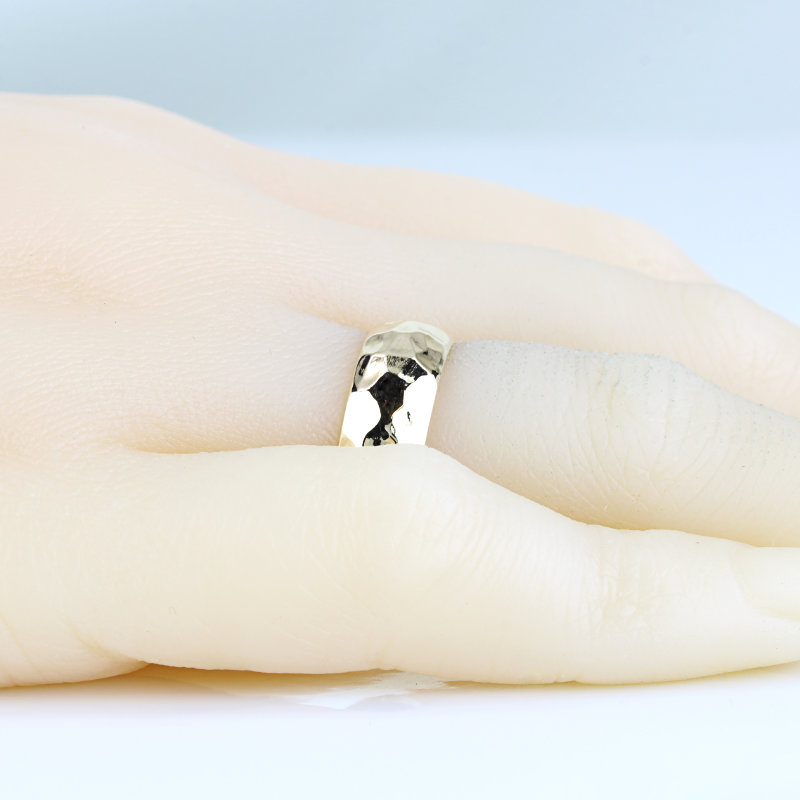 This vintage ring is made of 14 Karat Yellow Gold and has a unique hammered texture across the entire band. The band has a 6.4mm width and has “14K” and a “TW” hallmark stamped onto the inner side of it. Produced by Tessler & Weiss.