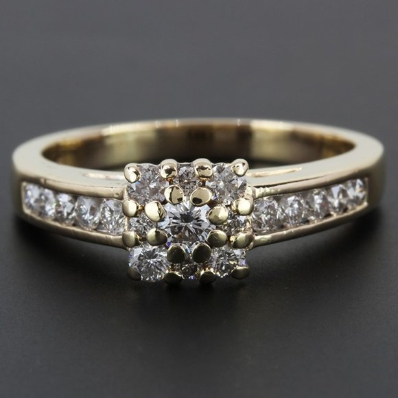 This stunning vintage bridal band, crafted in rich 14 karat yellow gold, features a classic square setting adorned with 19 round brilliant-cut diamonds, totaling 0.75 carats. The diamonds sparkle with enduring charm, making it a perfect symbol of everlasting love.