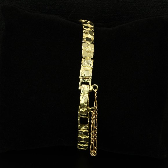 This timeless vintage ladies’ watch by Seiko is crafted from 14 karat yellow gold, showcasing a distinctive nugget-style design. It measures at 7.5 inches and is safely secured by a latch closure and additional chain for peace of mind. The stamps ‘SZ’ and ’14k” helps us determine the authenticity of this piece. Powered but a reliable quartz movement, this classic style watch is sure to catch attention wherever you go.