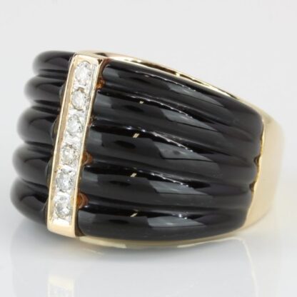 Crafted in solid 14 Karat Yellow Gold, this striking ring showcases a bold banded Onyx gemstone with a distinctive ribbed texture. Six round diamonds, totaling approximately 0.15 carats, are set in a vertical line down the center, adding brilliance and contrast to the deep black stone. The piece is stamped “14K” and can be resized by any qualified jeweler.